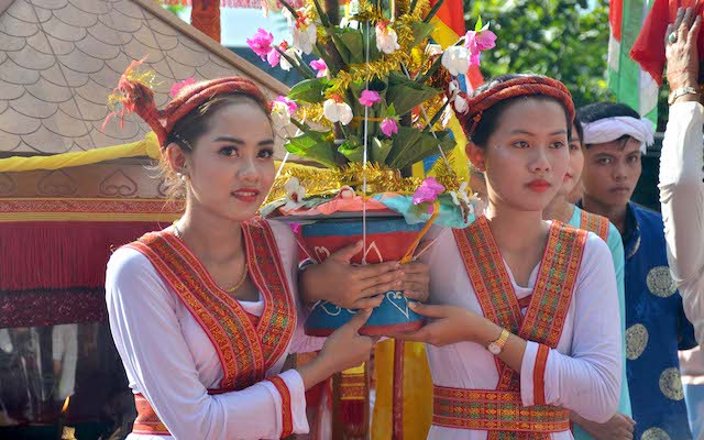 Thiếu nữ Chăm rước mâm lễ lên tháp thực hiện nghi thức cúng lễ.