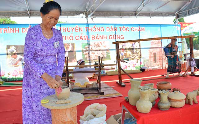 Trình diễn nghề làm gốm truyền thống của người Chăm tại lễ hội.