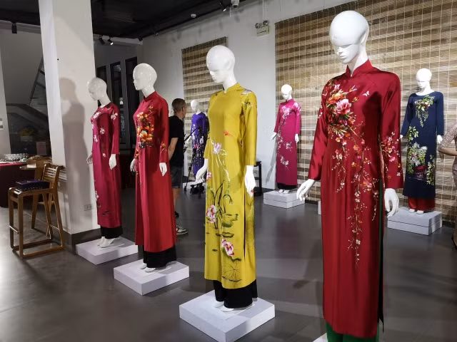 Một số mẫu áo dài cao cấp thương hiệu Tuấn Sành được trưng bày tại buổi giới thiệu.