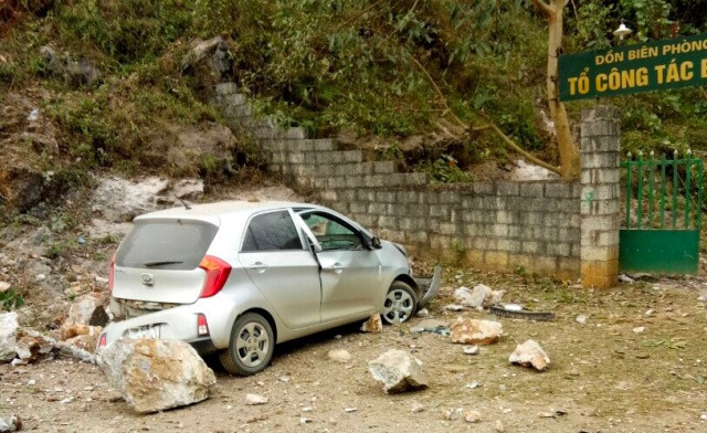 Dư chấn động đất làm đá lở gây hư hỏng xe ô-tô ở Lũng Phjắc, xã Đàm Thủy, huyện Trùng Khánh (Cao Bằng).