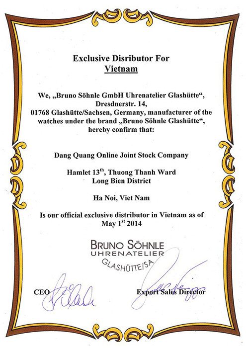 Với chứng nhận Glashutte/SA trên đồng hồ là chứng nhận cao nhất cho ngành đồng hồ, đồng hồ Bruno Sohnle đạt tiêu chuẩn cao nhất ở châu Âu.