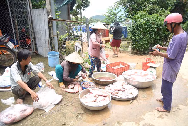 Người dân bán cá vừa vớt từ bè, hy vọng được đồng nào hay đồng đó.