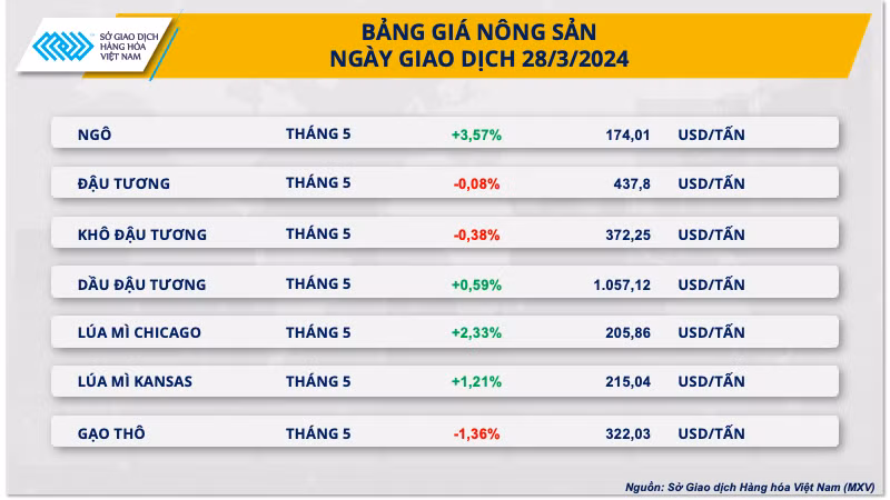 Theo MXV, kết thúc phiên giao dịch ngày hôm qua, sắc xanh chiếm ưu thế trên bảng giá các mặt hàng nông sản. Trong đó, giá ngô bật tăng 3,57% sau 4 phiên liên tiếp suy yếu và ghi nhận mức đóng cửa cao nhất kể từ giữa tháng 2.