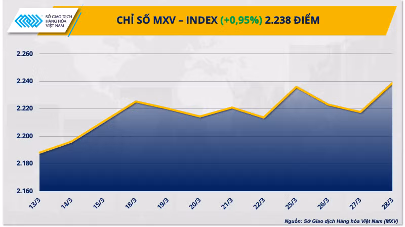 Số liệu từ Sở Giao dịch Hàng hóa Việt Nam (MXV) cho thấy, thị trường hàng hóa nguyên liệu thế giới ngày hôm qua (29/3) đón nhận lực mua tích cực. Chỉ số MXV-Index tăng 0,95% lên 2.238 điểm, cao nhất trong vòng 4 tháng trở lại đây. Giá trị giao dịch toàn Sở đạt trên 6.100 tỷ đồng, tăng 21,6%.