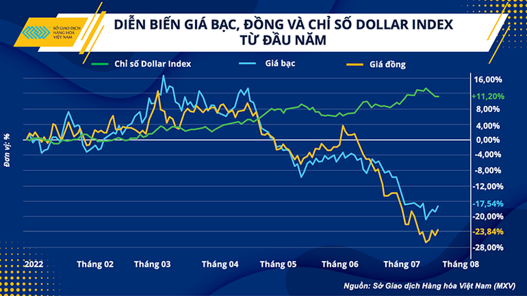 Kể từ đầu quý II cho đến nay, trước áp lực tăng lãi suất của Cục Dự trữ Liên bang Mỹ (FED), đồng Dollar Mỹ đã liên tục lập đỉnh cao nhất trong vòng 2 thập kỷ. Giá kim loại xác định xu hướng giảm rõ rệt và thường ngược chiều so với diễn biến của đồng bạc xanh, chịu tác động mạnh nhất bởi kỳ vọng tăng lãi suất của FED. Tính từ đợt tăng lãi suất đầu tiên của FED trong năm vào hồi giữa tháng 3, giá đồng đã đánh mất gần 30% và hiện đang dao động gần 7.400 USD/tấn. Trong khi đó, giá bạc cũng lao dốc khoảng 28%, xuống mức thấp nhất trong vòng 2 năm.
