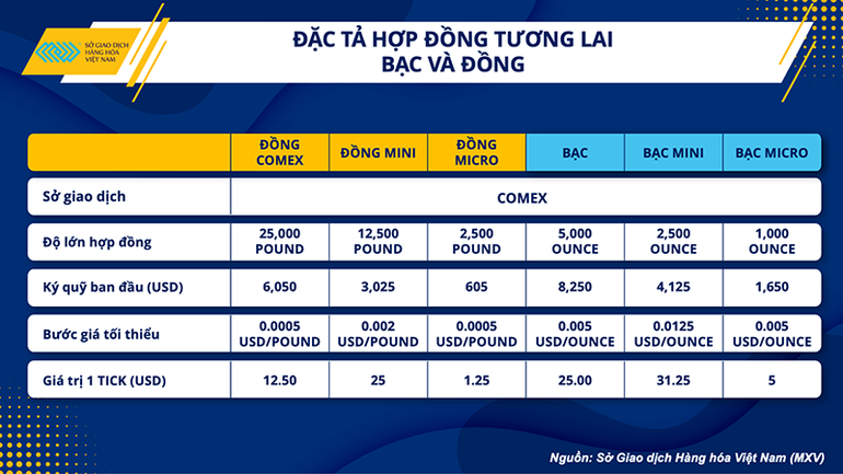 Nhằm hướng tới đa dạng đối tượng trong giao dịch hàng hóa, đặc biệt là mở rộng cơ hội tiếp cận thị trường kim loại vốn đang theo sát tình hình kinh tế vĩ mô, MXV triển khai thêm 4 sản phẩm mới bao gồm: Đồng mini, Bạc mini, Đồng micro và Bạc micro kể từ ngày 5/7/2022. Như vậy, với mức ký quỹ chỉ bằng 1 nửa đối với hợp đồng mini, và đặc biệt chỉ bằng 1/10 đối với hợp đồng micro, tương đương với khoảng gần 15 triệu cho 1 vị thế nắm giữ Đồng COMEX và chưa đến 20 triệu đối với Bạc, các nhà đầu tư đã có thể tìm kiếm lợi nhuận trên thị trường này.