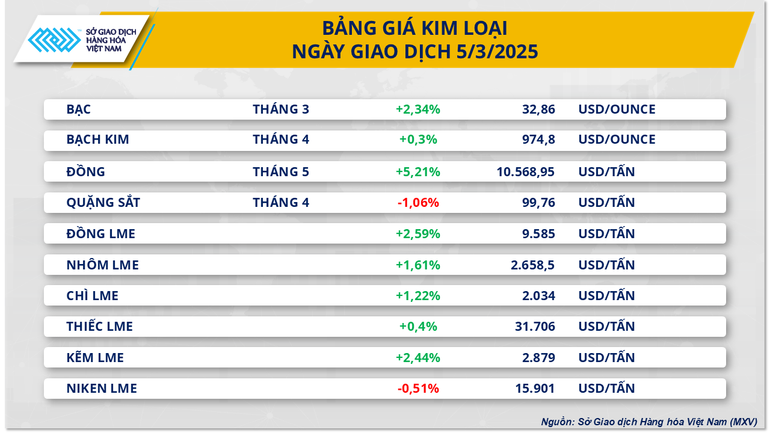 Theo MXV, khép lại phiên giao dịch ngày hôm qua, lực mua mạnh diễn ra trên thị trường kim loại giữa bối cảnh Mỹ siết chặt hàng rào thuế quan, làm dấy lên lo ngại về sự gián đoạn nguồn cung.