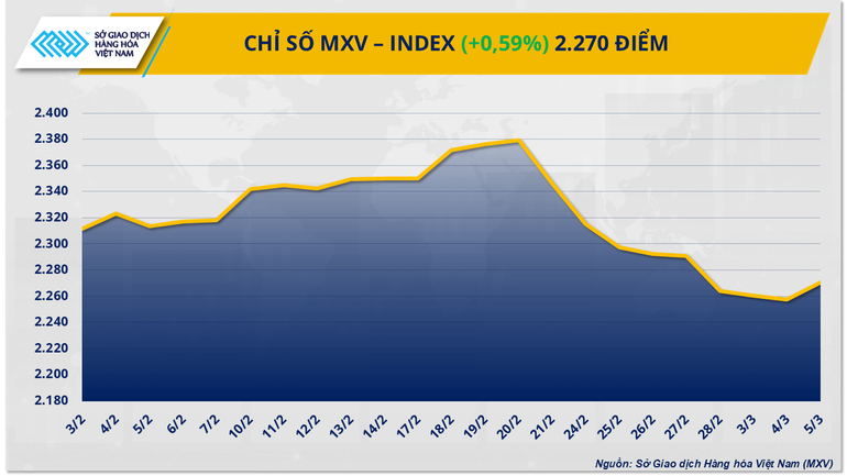 Theo MXV, sau 8 phiên liên tiếp chìm trong sắc đỏ, đóng cửa ngày giao dịch hôm qua (5/3), thị trường hàng hóa nguyên liệu thế giới đã quay đầu phục hồi. Lực mua chiếm ưu thế là kéo chỉ số MXV-Index lên gần 0,6% - mức 2.270 điểm.