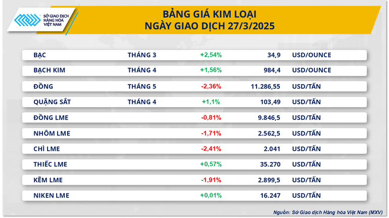Trên thị trường kim loại cơ bản, giá đồng COMEX bất ngờ quay đầu suy yếu 2,36%, lùi về mức 11.286 USD/tấn sau khi thị trường rộ lên đồn đoán rằng Mỹ có thể sớm áp thuế nhập khẩu đồng trong vài tuần tới, thay vì chờ đến hết thời hạn 270 ngày theo quy định của cuộc điều tra hiện tại.
