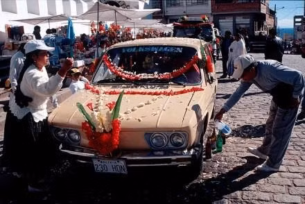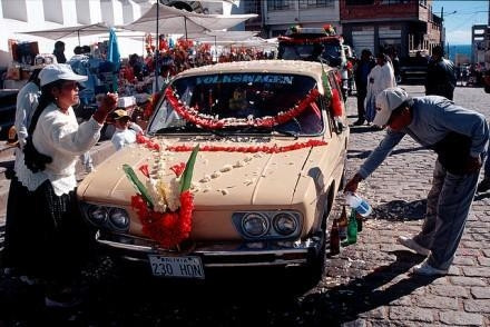 Hằng tuần, tại khu vực Copacabana gần hồ Titicaca ở đất nước Bolivia, chủ nhân của những chiếc xe ô-tô, taxi và xe buýt trang trí cho phương tiện của họ bằng những tràng hoa và hoa giấy sặc sỡ, sau đó xếp hàng để dự một buổi lễ gọi là “cầu phước cho xe cộ”. Sau khi các linh mục hoàn thành việc ban phước, các chủ xe và gia đình họ mở rượu sâm banh và đốt pháo hoa ăn mừng.