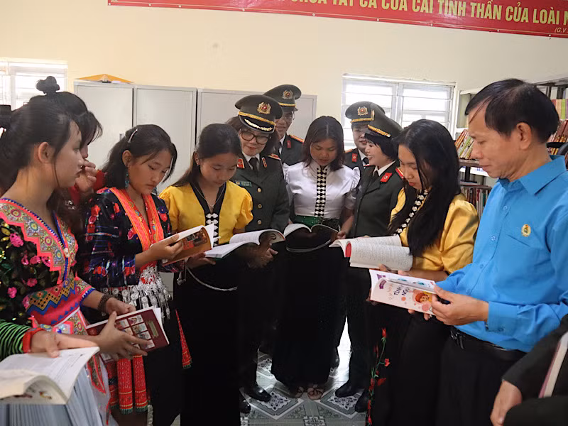| Hội Phụ nữ Công an Nhân dân trao máy tính, máy in và hơn 300 bộ áo dài tặng Phụ nữ xã Na Sang. |