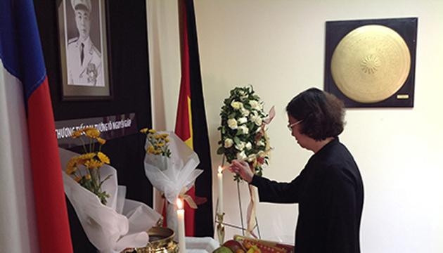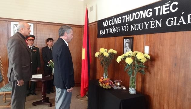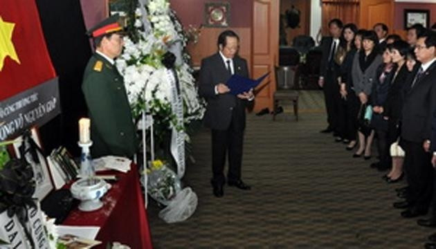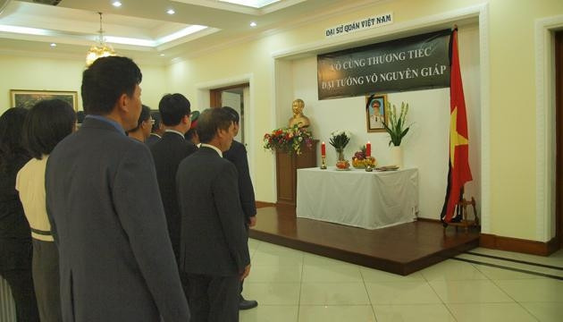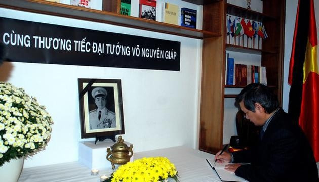 Trong ba ngày từ 12 đến 14-10, Đại sứ quán Việt Nam tại Nhật Bản, Hàn Quốc, Trung Quốc, Thái Lan, Campuchia, Singapore, Venezuela, Argentina, Nauy, Bulgaria, Sri Lanka, Đức,..., Phái đoàn Việt Nam tại LHQ đã mở sổ tang Đại tướng Võ Nguyên Giáp. Đến viếng Đại tướng, bạn bè quốc tế đều bày tỏ lòng kính trọng và ngưỡng mộ cuộc đời của vị Đại tướng huyền thoại của nhân dân Việt Nam, đồng thời chia sẻ với mất mát lớn lao mà nhân dân Việt Nam vừa phải trải qua trước sự ra đi của Đại tướng.