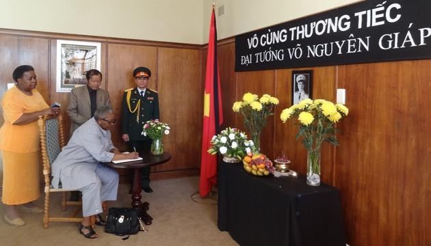 Trong không khí trang nghiêm và xúc động, Đại sứ Việt Nam tại Nam Phi Lê Huy Hoàng cùng tập thể cơ quan và đại diện cộng đồng đã làm lễ dâng hương tưởng nhớ Đại tướng. Đến viếng và ký sổ tang có nhiều đoàn đại biểu đại diện chính quyền, Quốc hội, Bộ Ngoại giao, các bộ ban ngành cùng Ngoại giao đoàn sở tại, trong đó có đại diện Đại sứ quán các nước khối ASEAN, Trung Quốc, Nga, Nhật Bản, CHDCND Triều Tiên, cùng nhiều Đại sứ quán các nước châu Âu, châu Phi, và Mỹ La tinh.