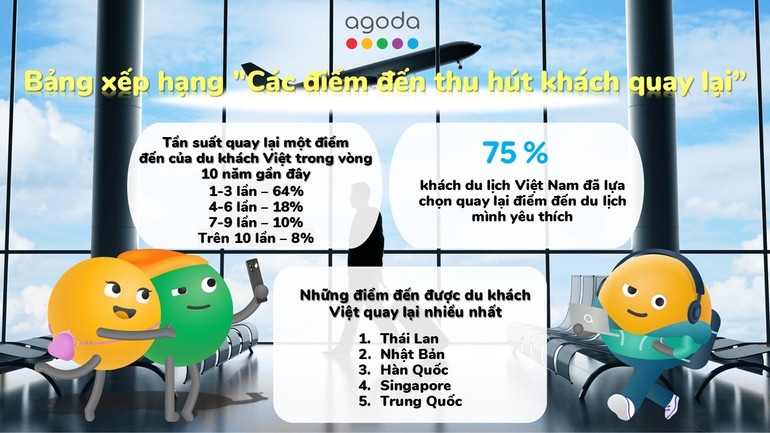 Được tổng hợp từ các lượt tìm kiếm trên nền tảng Agoda vào đầu tháng này, Bảng xếp hạng cho thấy, không chỉ Thái Lan, mà cả Nhật Bản, Hàn Quốc, Singapore và Trung Quốc đều là những điểm đến được du khách Việt Nam lựa chọn quay lại nhiều lần.