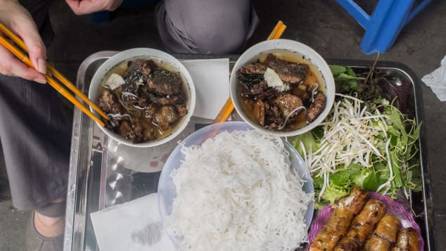 Phở có thể là món nổi tiếng nhất của ẩm thực Việt nhưng bún chả mới là lựa chọn hàng đầu cho bữa trưa của người dân Hà Nội mỗi ngày. Hãy nhìn vào những đám khói từ quạt chả từ lúc 11 giờ, khi các hàng bún chả nhỏ trên phố bắt đầu nướng thịt sau khi ướp trên than hoa. Món này được dọn nóng hổi ngay sau khi vừa quạt xong, với nước chấm pha chua mặn ngọt từ nước mắm, vài tép tỏi đập dập, đu đủ xanh, với một rổ rau sống và một đĩa bún tươi.
