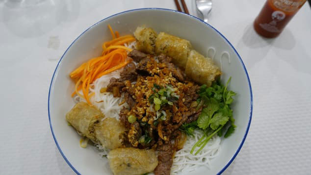 Món ăn nhìn rất đơn giản này chỉ bao gồm đậu rán, bún ăn kèm với mắm tôm, một loại mắm đặc biệt của người Việt. Miếng đậu được cắt ra rán ngập dầu vàng giòn, ăn kèm với rau sống.