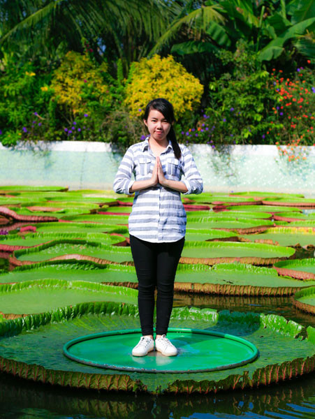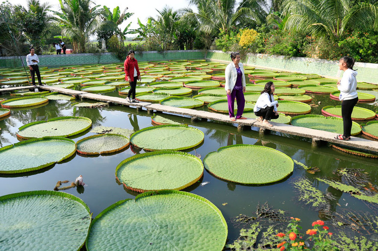 Nhiều du khách ở khắp nơi thích thú khám phá ngôi chùa có lá sen to phủ dầy trên mặt ao.