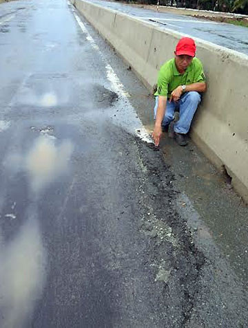 Vệt đùn bê-tông nhựa đường cao khoảng 5 cm, kéo dài khoảng 2 m trên đường dẫn vào cầu Cổ Chiên.