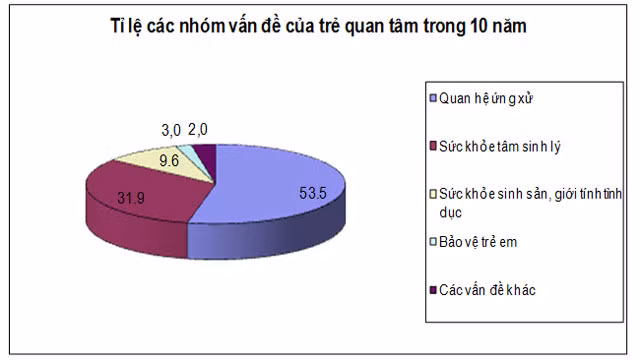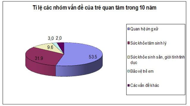 Đứng đầu là vấn đề quan hệ ứng xử, chiếm tỷ lệ cao nhất trong tổng số cuộc gọi trả lời với 53,5%. Tiếp đó là các vấn đề về sức khoẻ, tâm lý, chiếm 31,9%; sức khoẻ sinh sản chiếm 9,6%. Các vấn đề về bảo vệ trẻ em chiếm hơn 3%.