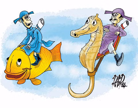 ... nhưng cưỡi ngựa gỗ thì đường còn xa lắm!!! Còn có ngựa cực hay, kể cả ngựa “Xích thố” mà xơi phải “Hố tử thần” đầy xác phong bì thì cũng đi tong. Chỉ có anh Táo quân là khôn, cưỡi cá ngựa, đỡ mang tiếng chơi trội ngựa ngoại, vừa độc đáo lại đậm đà bản sắc dân tộc, hơn đứt Táo quân cưỡi anh cá chép quá thường. Họa sĩ biếm xin góp vui mừng Tết Giáp Ngọ.