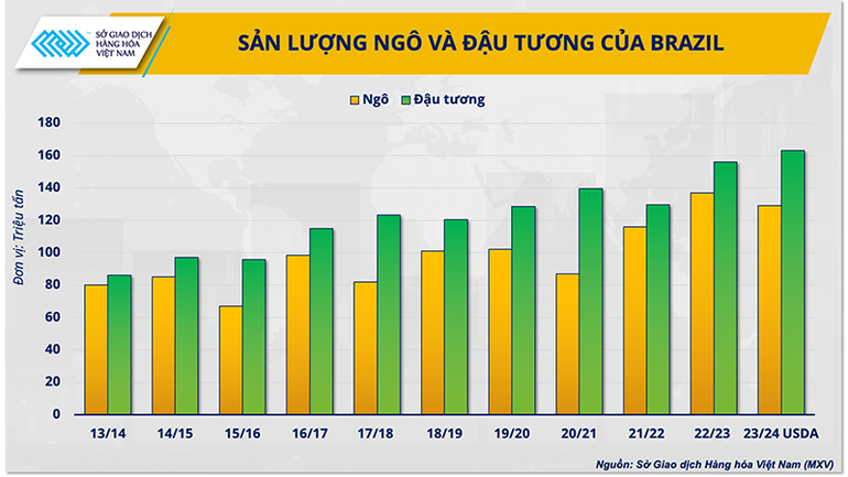 Tại nước láng giềng với Argentina là Brazil, tình trạng hạn hán đang khiến tiến độ trồng đậu tương niên vụ 2023/24 thấp hơn so với cùng kỳ năm ngoái. Ở bang Mato Grosso, bang sản xuất đậu tương lớn nhất của nước này, một số khu vực đã phải trồng lại đậu tương do đất thiếu độ ẩm. Việc trồng đậu tương chậm sẽ ảnh hưởng đến ngô vụ 2 được trồng sau khi thu hoạch đậu tương. Ngô vụ 2 trồng ngoài khung thời gian lý tưởng thường cho năng suất thấp hơn so với mức trung bình.