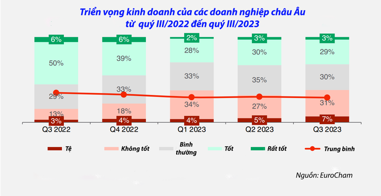 Trong bối cảnh nhiều thách thức, báo cáo cũng cho thấy những tín hiệu khích lệ với số lượng các nhà lãnh đạo doanh nghiệp châu Âu đánh giá tích cực về triển vọng kinh doanh trong quý III/2023 đã tăng 9% so với đánh giá cho quý trước.