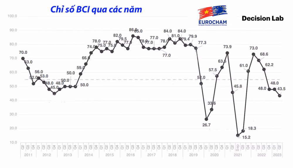 Đánh giá về BCI quý II/2023, Chủ tịch EuroCham Gabor Fluit cho biết, nền kinh tế Việt Nam chủ yếu dựa vào sản xuất và xuất khẩu, và đang phải chịu tác động lớn bởi tình hình khó khăn toàn cầu. Sự sụt giảm về xuất khẩu và các đơn hàng đã tác động lớn đến các doanh nghiệp châu Âu và cộng đồng doanh nghiệp nói chung.
