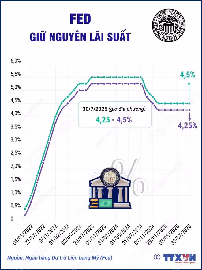 Ủy ban Thị trường mở liên bang (FOMC) bỏ phiếu với tỷ lệ 9-2 để giữ nguyên lãi suất điều hành trong khoảng 4,25-4,50%. Hầu hết các nhà hoạch định chính sách cho rằng Fed nên trì hoãn cắt giảm lãi suất để đánh giá tác động của thuế quan đến lạm phát. Một số ý kiến cũng nhấn mạnh rằng thị trường lao động mạnh mẽ cho phép họ kiên nhẫn hơn.