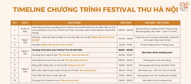 Tại buổi họp báo giới thiệu về chương trình diễn ra ngày 5/9, đại diện Ban tổ chức cho biết, Festival Thu Hà Nội lần thứ hai năm 2024 bao gồm nhiều nội dung phong phú, đặc sắc: Mô hình Cổng chào tái hiện hình ảnh Hà Nội nhộn nhịp ngập trong rừng cờ hoa chào đón đoàn quân chiến thắng trở về, mô hình “Cột cờ Hà Nội”, “Ga Hàng Cỏ - Chuyến tàu lịch sử”, “Ô Quan Chưởng”, “Vườn ánh sáng” được sắp đặt, dàn dựng thành các không gian trưng bày, tiểu cảnh giới thiệu các điểm đến du lịch hấp dẫn vào mùa thu như Cầu Long Biên, phố cổ Hà Nội; Không gian giới thiệu ẩm thực Hà Nội tại khu vực nhà Bát Giác với các món ăn truyền thống như cốm làng Vòng, bánh cốm Hàng Than, trà sen Tây Hồ, cà phê phố cổ, bánh mì Phố, nem nắm Chương Mỹ, ... kết hợp các hoạt động quảng diễn tinh hoa ẩm thực...; hoạt động trưng bày, giới thiệu Hà Nội qua ảnh theo chủ đề “Thu Hà Nội - Mùa thu lịch sử”; hoạt động nghệ thuật đường phố; chương trình khảo sát và tọa đàm “Điểm đến du lịch Thu Hà Nội”.