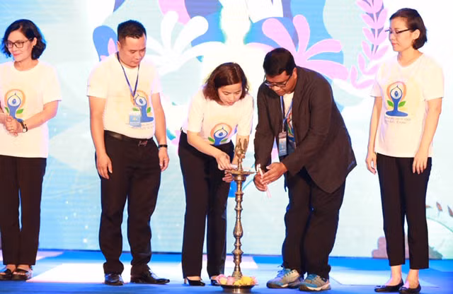 Phó Đại sứ Ấn Độ, lãnh đạo Bảo Việt Nhân thọ cùng ban tổ chức thực hiện nghi lễ thắp nến khai mạc chương trình.