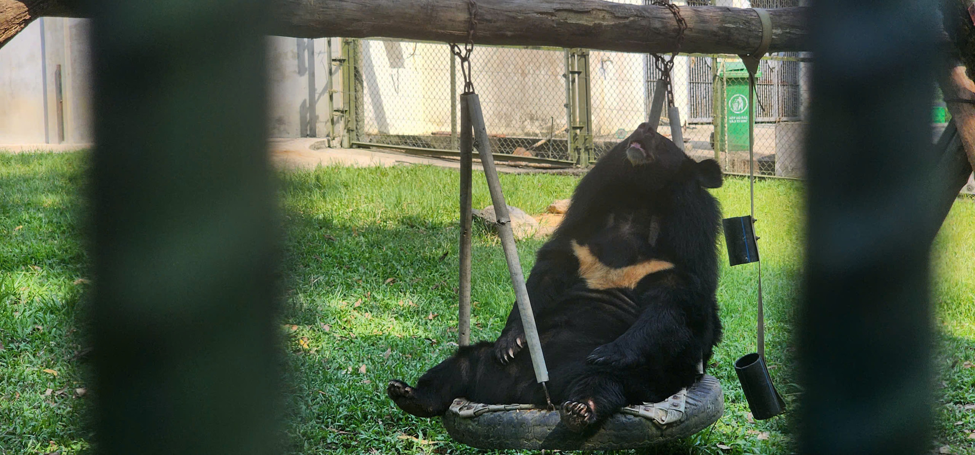Một chú gấu thảnh thơi chơi xích đu tại Trung tâm Cứu hộ gấu lớn nhất Việt Nam.