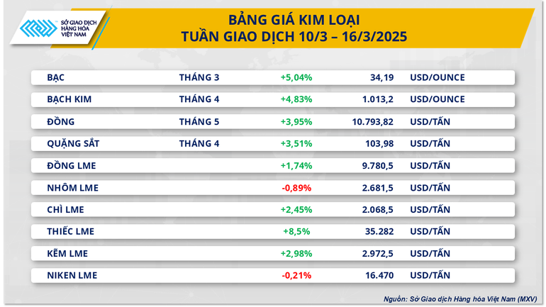 Không chỉ kim loại quý, nhóm kim loại cơ bản cũng có tuần giao dịch khởi sắc. Giá đồng COMEX tăng mạnh 3,95%, chạm mức 4,9 USD/pound (tương đương 10.793 USD/tấn) – cao nhất kể từ cuối tháng 5/2024. Giá thiếc trên Sàn giao dịch Kim loại London (LME) tăng vọt 8,5% lên 35.282 USD/tấn, trong khi giá quặng sắt cũng ghi nhận mức tăng 3,5%, đạt 103,9 USD/tấn.