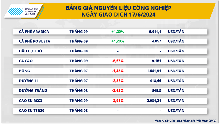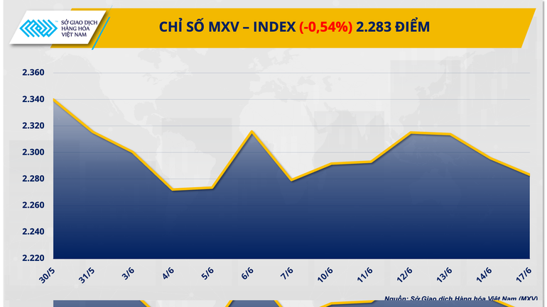 Theo số liệu từ Sở Giao dịch hàng hóa Việt Nam (MXV), đóng cửa ngày 17/6, thị trường hàng hóa nguyên liệu thế giới diễn biến phân hóa. Các mặt hàng trong nhóm năng lượng tăng giá trong khi nhóm nông sản, nguyên liệu công nghiệp và kim loại đồng loạt giảm đã khiến chỉ số MXV-Index suy yếu 0,54% xuống 2.283 điểm, nối dài chuỗi giảm 3 phiên liên tiếp.