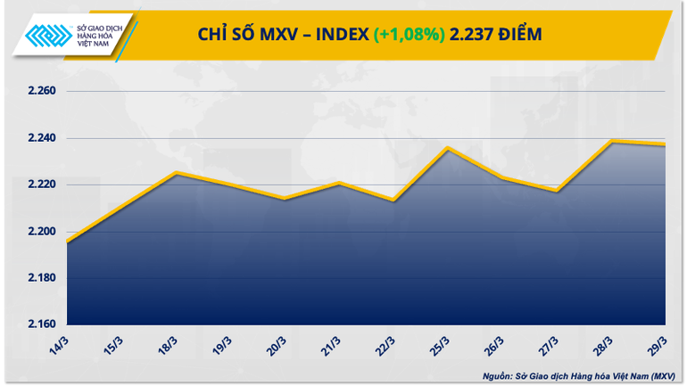 Số liệu từ Sở Giao dịch Hàng hóa Việt Nam (MXV) cho thấy, đóng cửa tuần giao dịch cuối cùng của tháng 3 (25-29/3), lực mua hoàn toàn áp đảo đối với 3 trên 4 nhóm hàng hóa nguyên liệu đang được giao dịch liên thông thế giới tại MXV, bao gồm Công nghiệp, Năng lượng và Nông sản; hỗ trợ chỉ số MXV-Index tiếp tục tăng 1,08% lên 2.237 điểm.