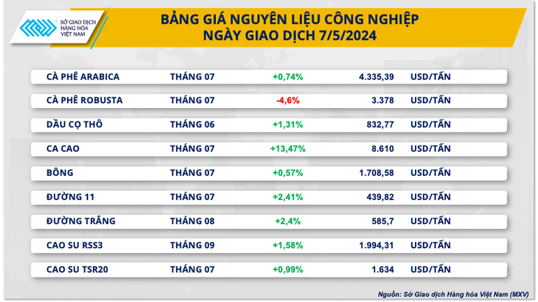 Kết thúc ngày 7/5, giá ca-cao tăng vọt 13,47%, dẫn dắt đà tăng của toàn thị trường. MXV đánh giá, yếu tố cơ bản nhìn chung vẫn hỗ trợ xu hướng giá bất chấp đợt giảm mạnh gần đây. Thời tiết khô hạn tại Bờ Biển Ngà, quốc gia sản xuất ca-cao hàng đầu thế giới tiếp tục làm sâu sắc thêm lo ngại về nguồn cung. Nông dân nước này cho biết, kích thước hạt ca-cao vụ giữa mùa đang khá nhỏ do tình trạng thiếu mưa.