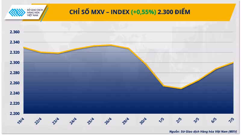Số liệu từ Sở Giao dịch Hàng hóa Việt Nam (MXV) cho thấy, lực mua áp đảo trên thị trường hàng hóa nguyên liệu thế giới trong ngày hôm qua, hỗ trợ chỉ số MXV-Index chốt ngày tăng 0,55% lên 2.300 điểm, nối dài đà hồi phục sang ngày thứ 3 liên tiếp; đồng thời đạt mức cao nhất trong hơn 1 tuần trở lại đây. Giá trị giao dịch toàn Sở tăng 1,4%, đạt trên 5.000 tỷ đồng.