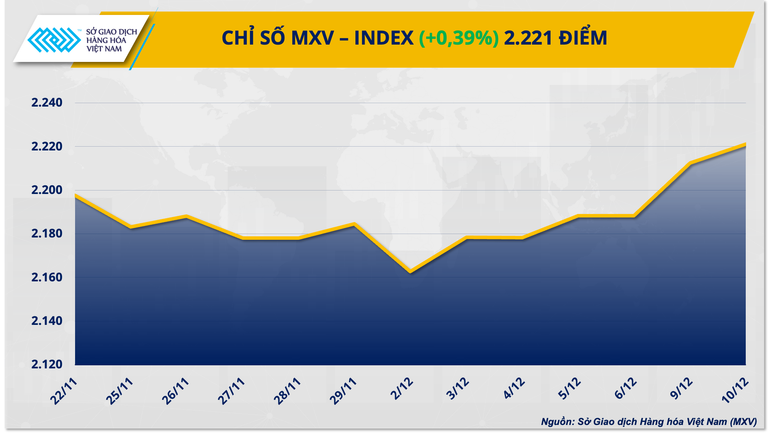 Theo Sở Giao dịch Hàng hóa Việt Nam (MXV), sắc xanh áp đảo trên bảng giá hàng hóa nguyên liệu thế giới trong phiên giao dịch ngày hôm qua (10/12). Đóng cửa, chỉ số MXV-Index tăng 0,39% lên 2.221 điểm. Đáng chú ý, trên thị trường nguyên liệu công nghiệp, giá mặt hàng cà-phê Arabica tiếp tục chinh phục kỷ lục lịch sử khi tiến sát mốc 7.400 USD. Bên cạnh đó, thị trường nông sản cũng có 5 trên 7 mặt hàng đồng loạt tăng giá tích cực, trong đó ngô ghi nhận phiên tăng thứ tư liên tiếp.