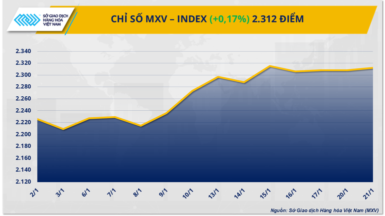 Bên cạnh đó, thị trường nguyên liệu cũng đón nhận những thông tin tích cực, nổi bật là giá ca-cao tăng gần 3,5% lên mức cao nhất kể từ đầu đầu tháng 1 đến nay. Đóng cửa, chỉ số MXV-Index nhích nhẹ 0,17% lên trên mức 2.312 điểm, nối dài đà tăng 3 phiên liên tiếp.