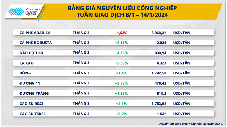 Ở chiều ngược lại, Arabica là mặt hàng duy nhất mang sắc đỏ của nhóm nguyên liệu công nghiệp với mức giá giảm 1,53% so với tham chiếu. Nguồn cung dần có tín hiệu cải thiện đã gây sức ép lớn, khiến giá trái chiều với hầu hết các mặt hàng trong nhóm.