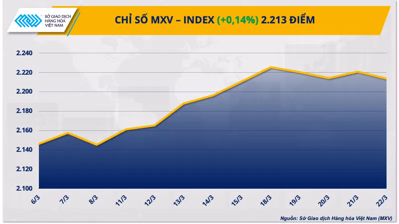 Theo MXV, trong tuần giao dịch vừa qua (18-22/3), thị trường hàng hóa biến động mạnh. Điều này thể hiện qua sự phân hóa, giằng co rõ rệt trên diễn biến giá của các mặt hàng. Chốt tuần, sắc xanh bao trùm 3/4 nhóm mặt hàng hỗ trợ chỉ số MXV-Index tăng thêm 0,14% lên 2.213 điểm. Giá trị giao dịch toàn Sở trung bình tuần ở mức 6.700 tỷ đồng mỗi ngày.