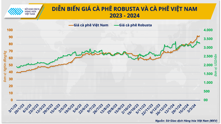 Trong hơn hai tháng đầu năm 2024, giá cà-phê Robusta trên Sở Giao dịch Liên lục địa Châu Âu (ICE-EU) liên tục phá vỡ kỷ lục. Theo ghi nhận từ MXV, giá cà phê Robusta đã chạm mức cao nhất 30 năm vào ngày 7/3 vừa qua khi đóng cửa tại 3.381 USD/tấn.