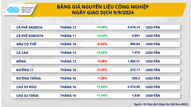 Theo Sở Giao dịch Hàng hóa Việt Nam (MXV), lực mua mạnh mẽ đã quay trở lại thị trường hàng hóa nguyên liệu thế giới trong phiên giao dịch đầu tuần (9/9). Hầu hết các mặt hàng đều lấy lại sắc xanh tích cực.