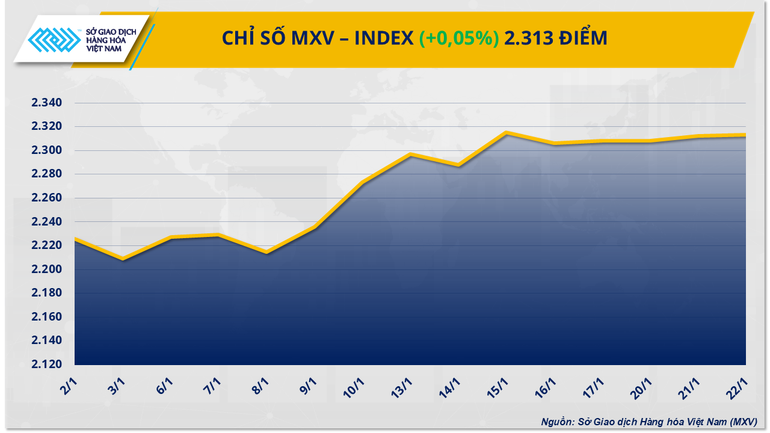 Theo Sở Giao dịch Hàng hóa Việt Nam (MXV), thị trường hàng hóa nguyên liệu thế giới diễn biến phân hóa trong phiên giao dịch hôm qua (22/1). Đóng cửa, chỉ số MXV-Index nhích nhẹ lên trên mức 2.313 điểm, nối dài chuỗi tăng 4 phiên liên tiếp.