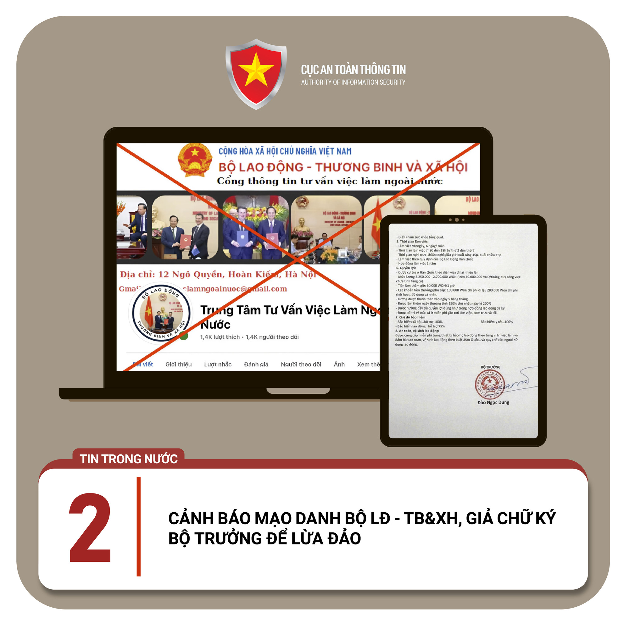 Ngoài ra, các đối tượng mạo danh chữ ký của Bộ trưởng Đào Ngọc Dung, đăng tải nội dung kèm theo hình ảnh lãnh đạo Bộ làm việc với đối tác nước ngoài, nhằm tạo dựng lòng tin để dụ dỗ người lao động tham gia các chương trình làm việc tại Australia, chương trình EPS (Hàn Quốc)… thông qua các fanpage (trang tương tác được tạo từ tài khoản facebook cá nhân hoặc doanh nghiệp) và website (trang web) giả mạo.