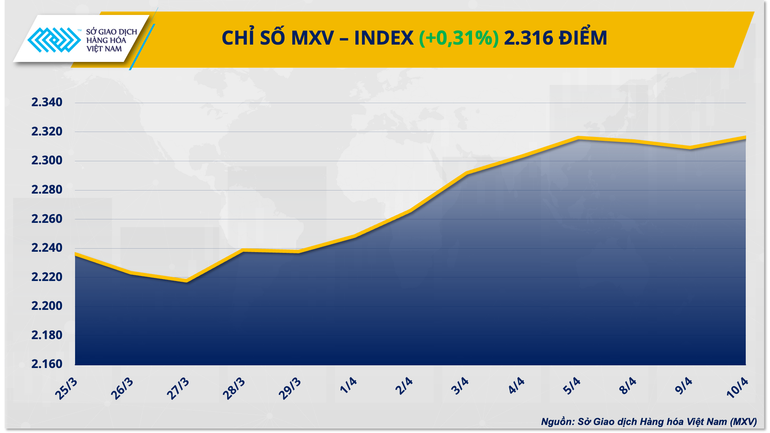 Số liệu từ Sở Giao dịch Hàng hóa Việt Nam (MXV) cho thấy, kết thúc ngày giao dịch 10/4, lực mua chiếm ưu thế trở lại trên thị trường hàng hóa nguyên liệu thế giới, hỗ trợ chỉ số MXV-Index đảo chiều hồi phục sau 2 ngày suy yếu nhẹ liên tiếp, với mức tăng 0,31% lên 2.316 điểm, trở lại vùng cao nhất trong gần 7 tháng. Giá trị giao dịch toàn Sở cũng tăng 9% so ngày trước đó, đạt trên 8.100 tỷ đồng, cao nhất trong hơn 1 tuần.