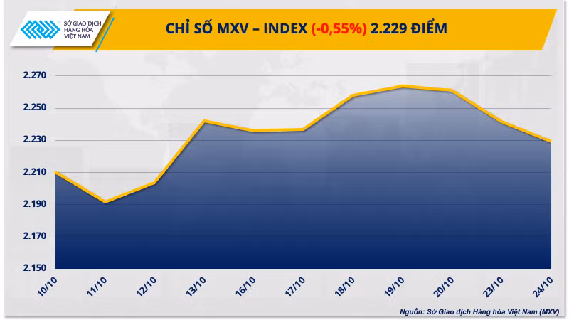 Số liệu từ Sở Giao dịch Hàng hóa Việt Nam (MXV) cho thấy, đóng cửa hôm qua 24/10, sắc xanh đỏ đan xen trên bảng giá hàng hóa nguyên liệu thế giới. Tuy nhiên, lực bán vẫn cho thấy sự áp đảo, kéo Chỉ số MXV-Index giảm 0,55% xuống 2.229 điểm, nối dài đà suy yếu sang ngày thứ 3 liên tiếp. Mặc dù vậy, giá trị giao dịch toàn Sở vẫn đạt 4.100 tỷ đồng, tăng hơn 3% so ngày trước đó.