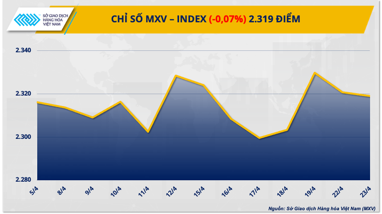 Số liệu từ Sở Giao dịch Hàng hóa Việt Nam (MXV) cho thấy, thị trường hàng hóa nguyên liệu thế giới diễn biến phân hóa trong ngày giao dịch hôm qua (23/4). Sắc xanh phủ kín bảng giá nông sản và năng lượng, trong khi đó, sắc đỏ áp đảo trên nhóm nguyên liệu công nghiệp và kim loại. Đóng cửa, chỉ số MXV-Index biến động không đáng kể, giảm nhẹ về 2.319 điểm. Giá trị giao dịch toàn Sở đạt trên 6.100 tỷ đồng. Dòng tiền đầu tư tiếp tục tập trung ở nhóm năng lượng và kim loại, chiếm đến 73% tổng khối lượng giao dịch của toàn thị trường.