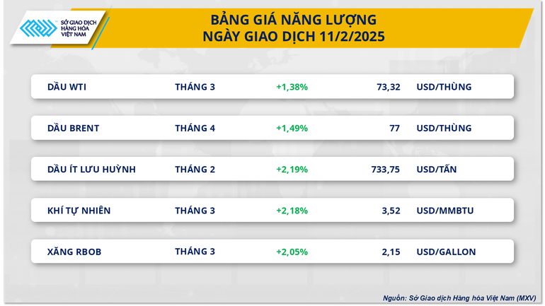 Ngày 11/2, toàn bộ 5 mặt hàng trong nhóm năng lượng đồng loạt tăng giá. Giá dầu thô quay lại mức cao nhất trong vòng 2 tuần. Giá dầu Brent tăng 1,13 USD tương đương với 1,5% lên mức 77 USD/thùng, giá dầu WTI tăng 1 USD tương đương 1,4%, lên mức 73,32 USD/thùng.