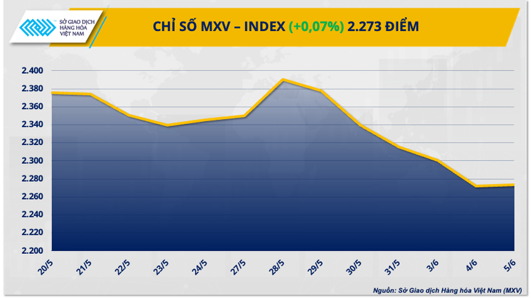 Theo Sở Giao dịch Hàng hóa Việt Nam (MXV), thị trường hàng hóa nguyên liệu thế giới diễn biến phân hóa trong ngày giao dịch hôm qua 5/6. Sắc xanh đỏ đan xen trên bảng giá, tuy nhiên lực mua có phần chiếm ưu thế hỗ trợ chỉ số MXV-Index chốt ngày nhích nhẹ 0,07% lên 2.273 điểm, đứt chuỗi giảm 5 ngày liên tiếp trước đó.