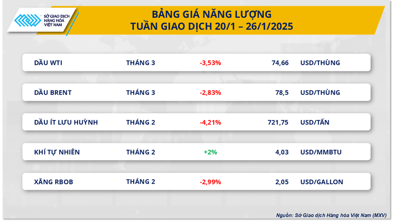 Tuần giao dịch vừa qua (20-26/1), lực bán chiếm áp đảo trên thị trường năng lượng. Đáng chú ý, trên thị trường dầu thô, ngay sau ngày ông Donald Trump quay lại Nhà trắng, giá hai mặt hàng đã quay đầu trượt dốc. Sắc đỏ kéo dài trong cả tuần khiến giá dầu càng rời xa mốc 80 USD/thùng và chỉ hồi phục nhẹ vào phiên giao dịch ngày thứ Sáu (24/1).
